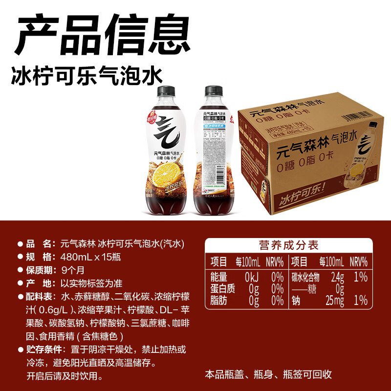 元气森林气泡水 冰柠可乐 480ml*15 (0糖0脂0卡)