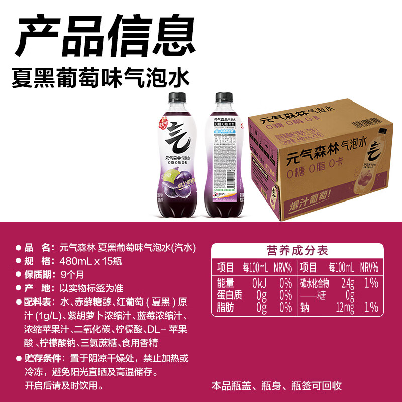 元气森林气泡水 夏黑葡萄 480ml*15 (0糖0脂0卡)