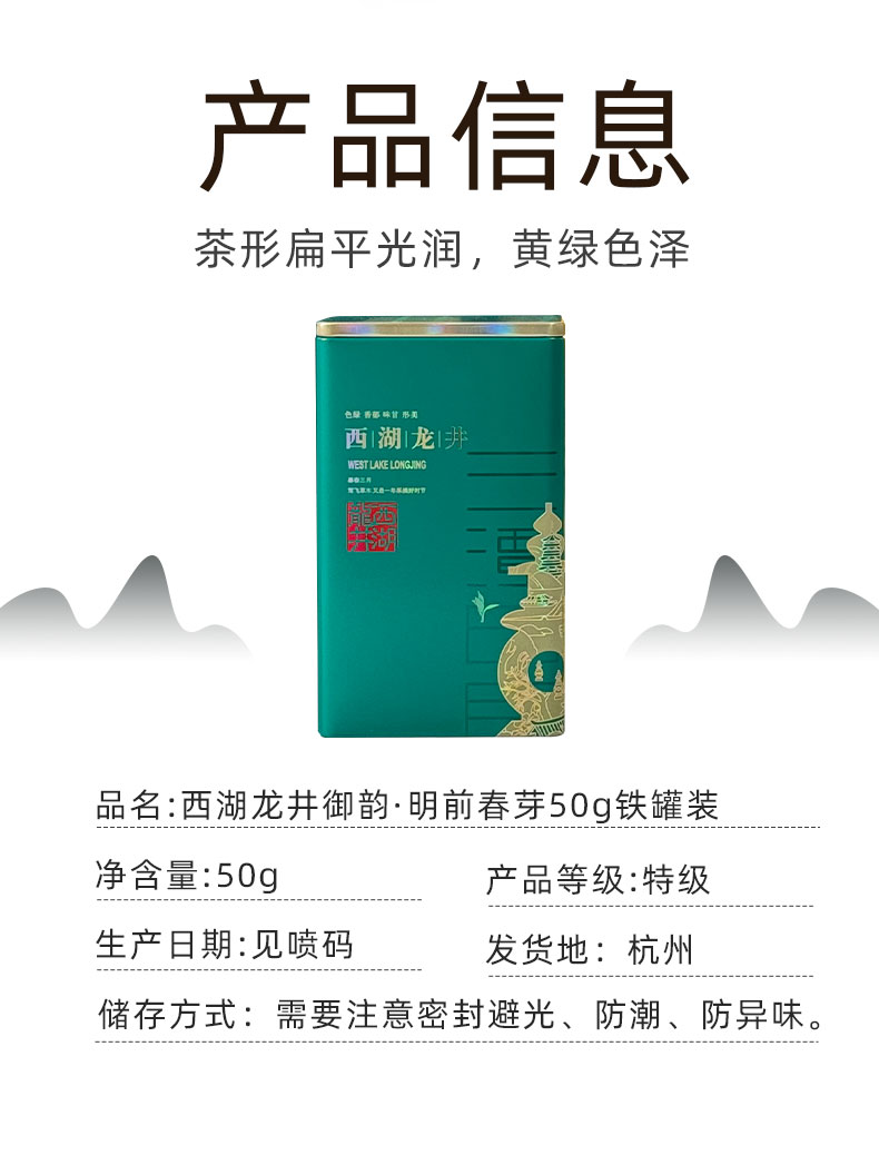 首页 > 茗茶酒水饮料 > 老侯爷茶叶 > 西湖龙井御韵·明前春芽50g铁罐装