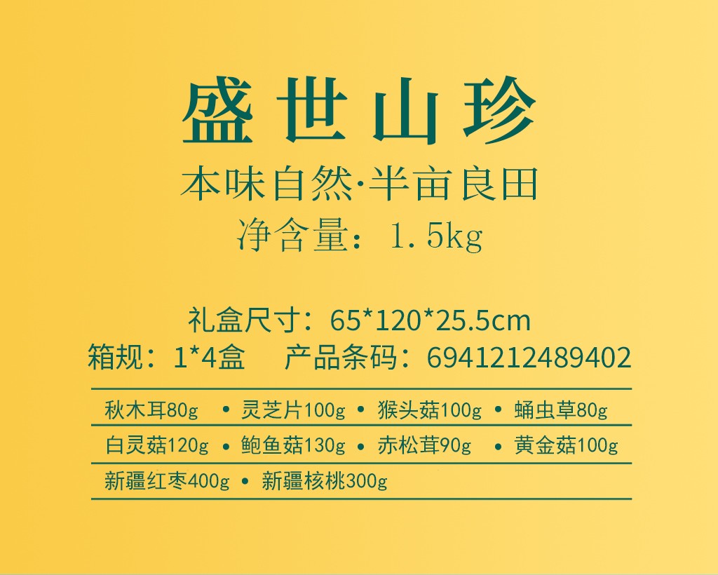首页 > 粮油调味干货 > 半亩良田-干菌杂粮 > 盛世山珍