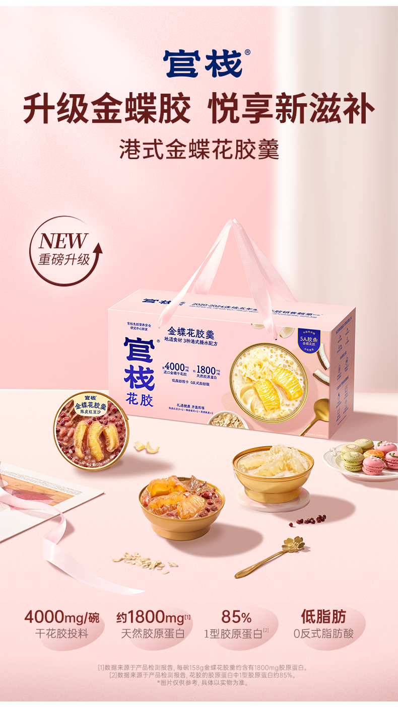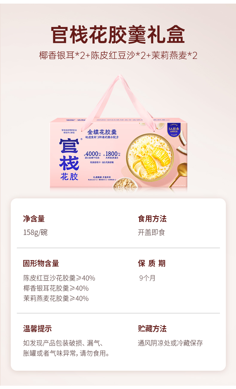 首页 > 滋补营养系列 > 官栈 > 官栈金蝶花胶羹158gx6礼盒
