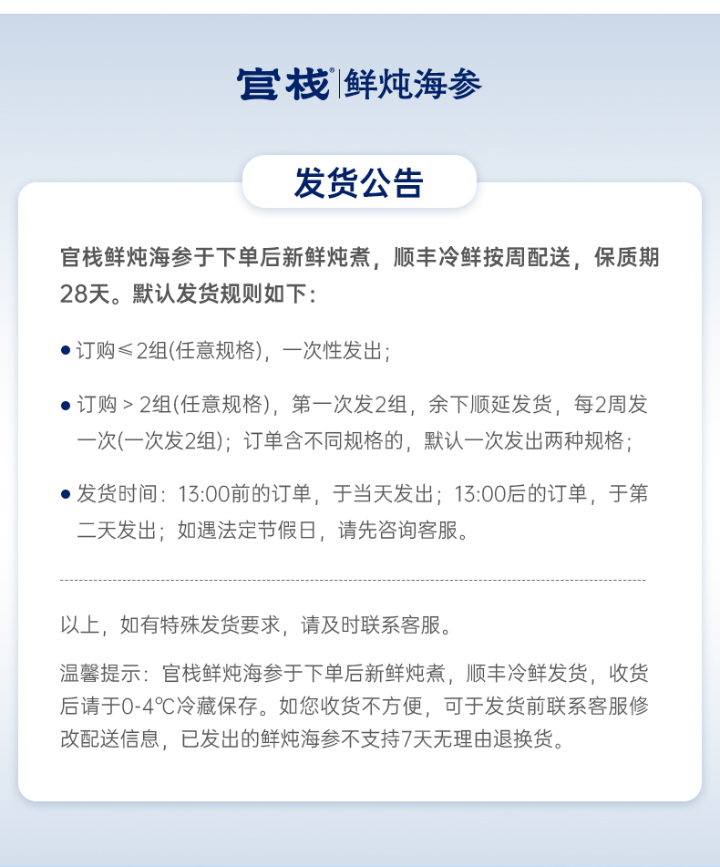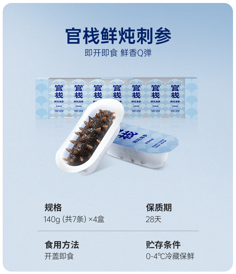 首页 > 滋补营养系列 > 官栈 > 官栈 鲜炖海参·鲜香刺参140g*4盒 【月卡】