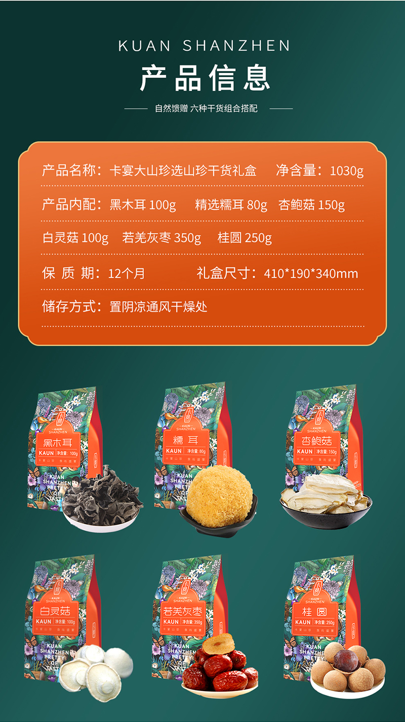 首页 > 粮油调味干货 > 卡宴山珍礼盒 > 卡宴大山珍选山珍干货礼盒1030g