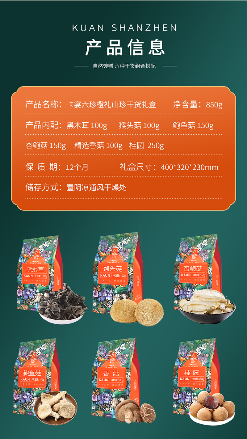 首页 > 粮油调味干货 > 卡宴山珍礼盒 > 卡宴六珍橙礼山珍干货礼盒850g
