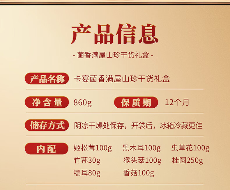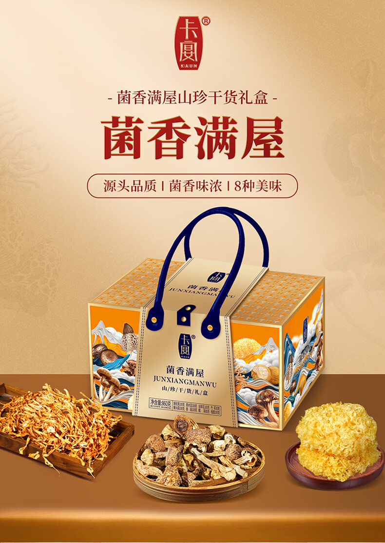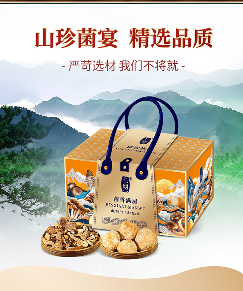 首页 > 粮油调味干货 > 卡宴山珍礼盒 > 卡宴菌香满屋山珍干货礼盒860g