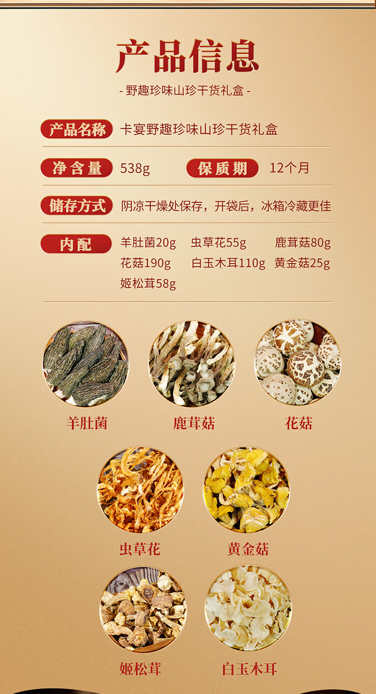 首页 > 粮油调味干货 > 卡宴山珍礼盒 > 卡宴野趣珍味山珍干货礼盒538g