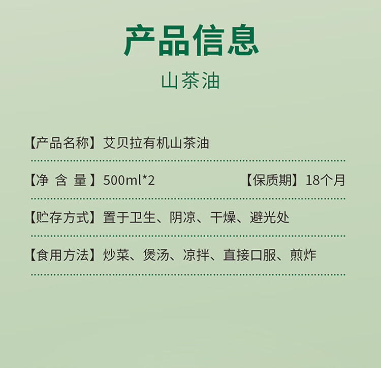 首页 > 粮油调味干货 > 艾贝拉油类系列 > 艾贝拉有机山茶油礼盒500ml*2