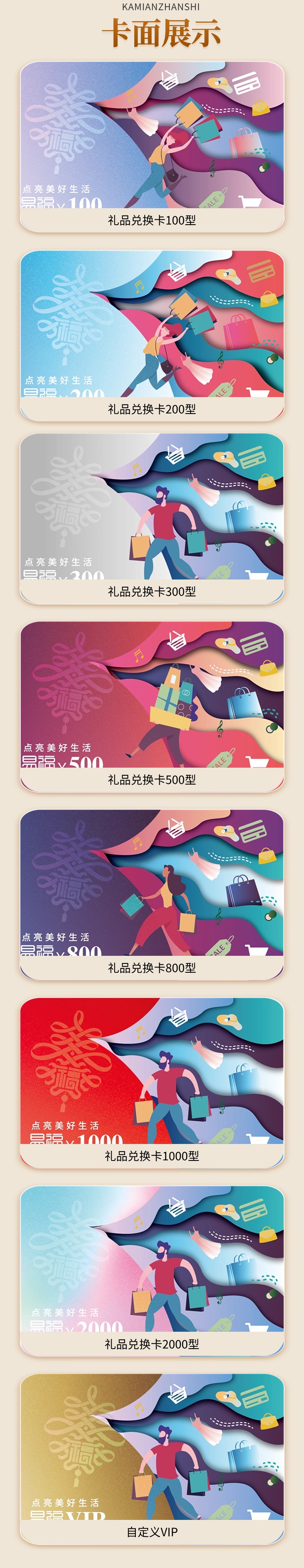 • 备 注: 节日礼品卡册可专属定制:可添加贵公司LOGO、祝福语、领导签名、企业文化等!客户送礼、企事业单位员工福利最佳选择!(全国免费配送)本店所有礼品均可制作成礼品卡!欢迎来电咨询:15301080546