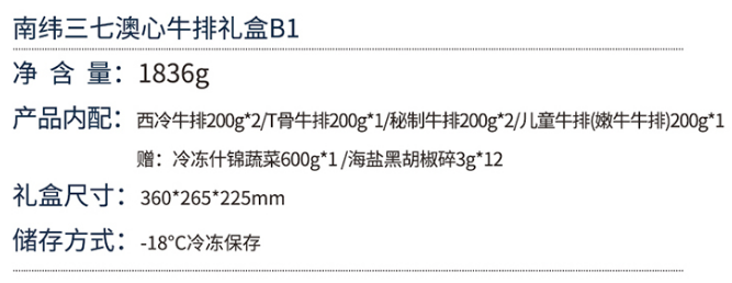 首页 > 生鲜熟食腊味 > 南纬三七牛排礼盒/配送券 > 南纬三七澳心牛排B礼盒1836g