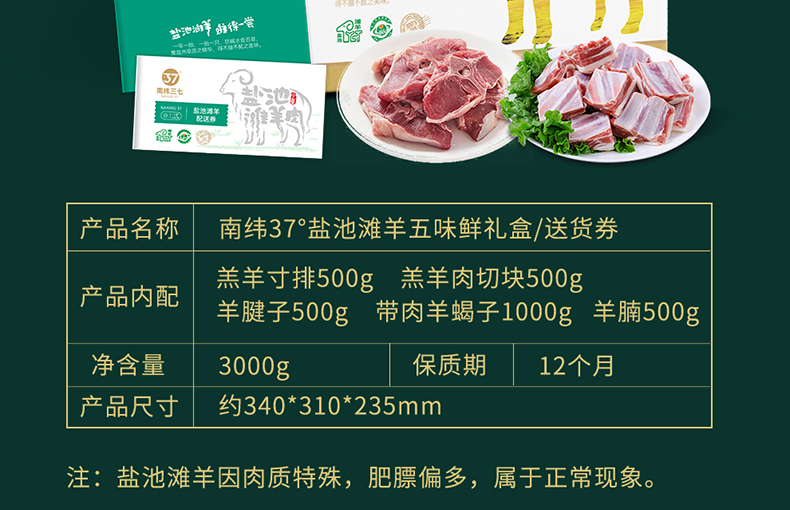 首页 > 生鲜熟食腊味 > 南纬三七盐池滩羊礼盒/配送券 > 南纬三七盐池滩羊五味鲜礼盒3000g