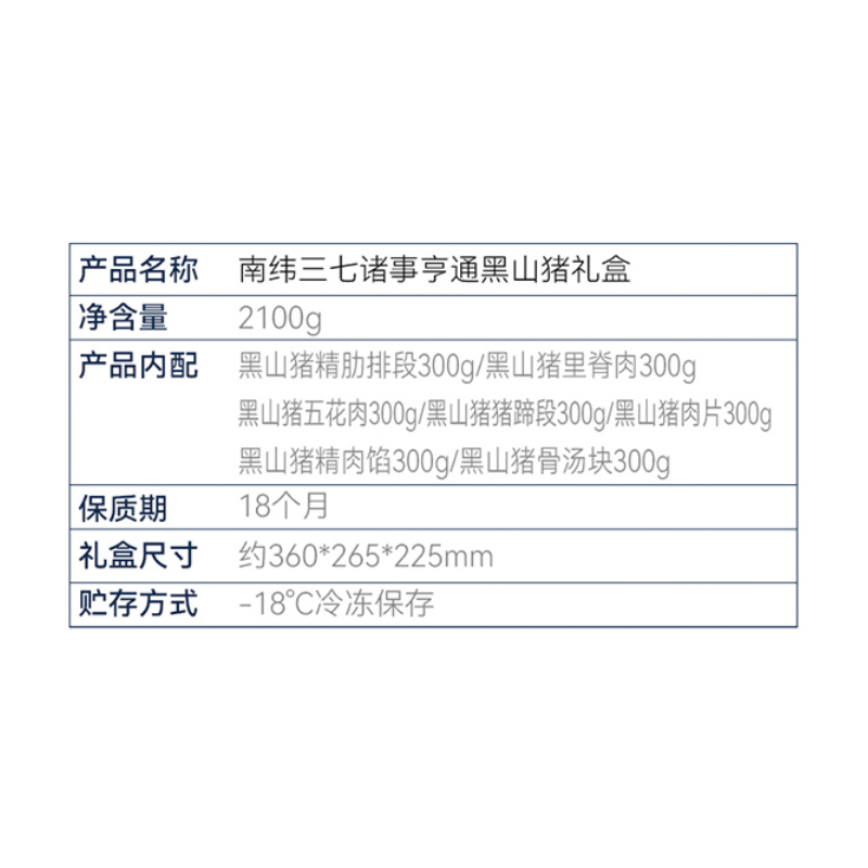 首页 > 生鲜熟食腊味 > 南纬三七黑猪肉礼盒/配送券 > 南纬三七诸事亨通黑山猪礼盒2100g