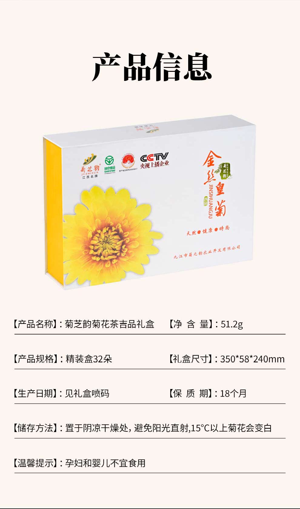 首页 > 茗茶酒水饮料 > 菊芝韵菊花礼盒 > 菊芝韵菊花茶吉品礼盒32朵36g
