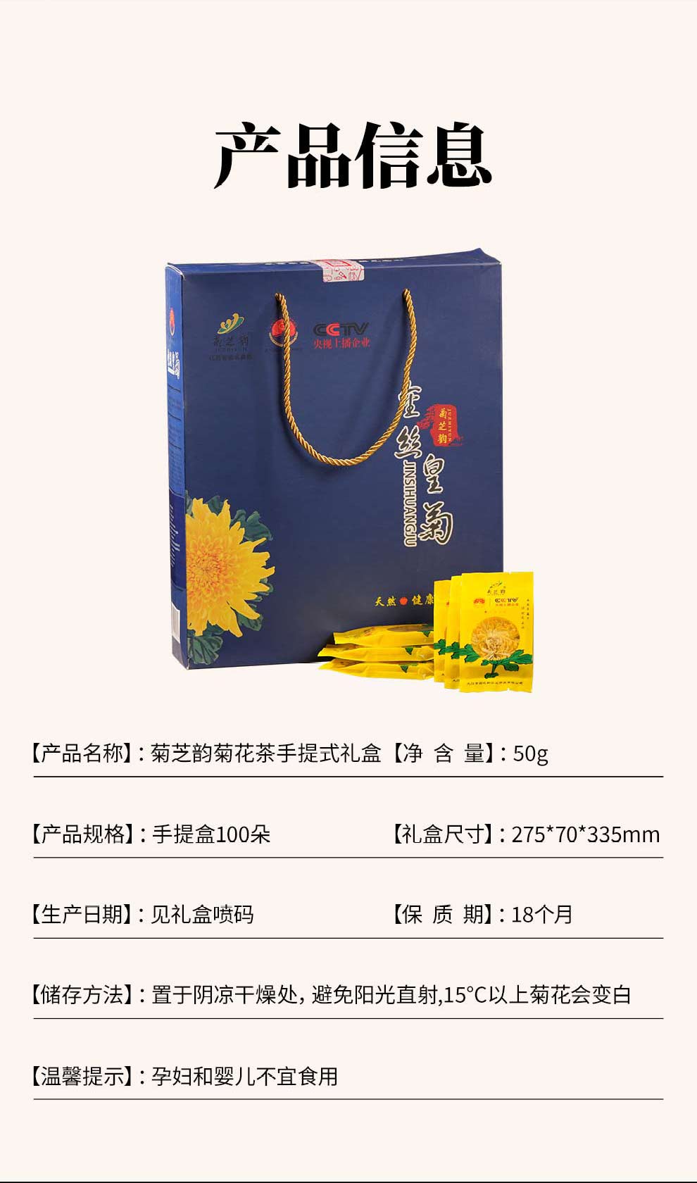 首页 > 茗茶酒水饮料 > 菊芝韵菊花礼盒 > 菊芝韵菊花茶手提式礼盒100朵60g