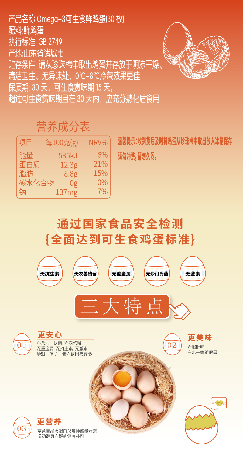 首页 > 水果蔬菜鸡蛋 > 鸡蛋系列 > 阳光蛋仔可生食Omega-3鲜鸡蛋30枚